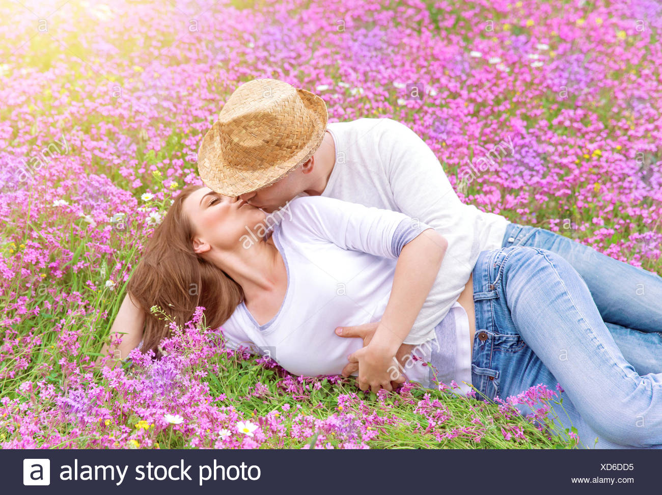 Couple In Love Kissing While Laying Down On A Meadow Stock Photo