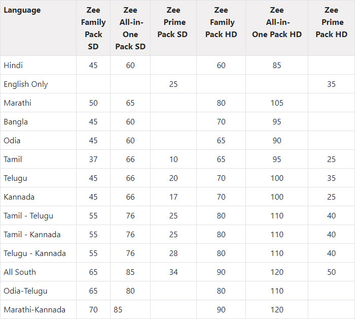 Zee Family Pack Zee Value Pack Zee Channel Pack Zee Wala Pack