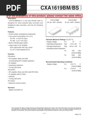 Fmam radio cxa1619bs datasheet cxa1619bs circuit cxa1619bs data sheet. Sony cannot assume responsibility for. Fmam radio online from elcodis view and download cxa1619bs pdf datasheet in stock specifications.