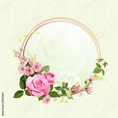 Vintage Round Frame With Pink Roses Spring Blossom Branches With