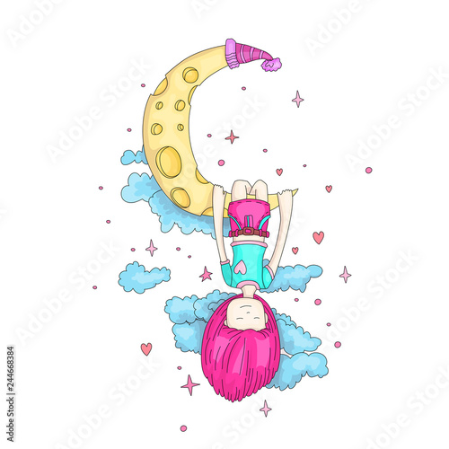 Colorless A Little Girl Sleeping And Dreaming Hanging On A Crescent