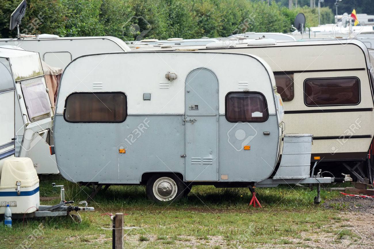 An Outmoded Travel Trailer In A Row Of Old Fashioned Caravans