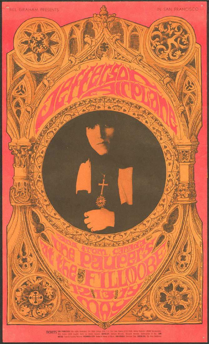 82 1372 41 jefferson airplane poster. Unique in its simplicity bg001 lacks the stylized lettering and imagery which would later become the signature style of san francisco rock posters. 78 39 jefferson airplane poster about wes wilson when the avalon ballroom and bill grahams fillmore auditorium began to hold weekly dance concerts wilson was called upon to design the posters.